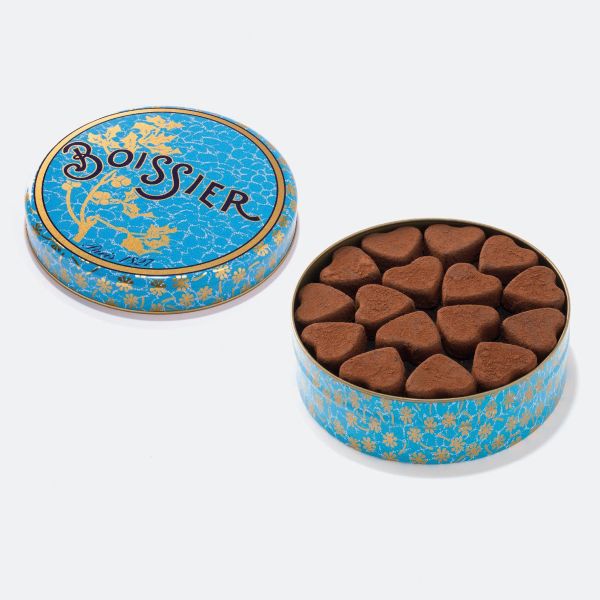 Diese duftende, mit Kakaopulver überzogene Schokoladentrüffel in Herzform sind in dieser romantischen Pralinendose. Aus der Pariser Confiserie Boissier (seit 1827). In jeder Dose befinden sich 48 kleine Trüffel-Herzen.